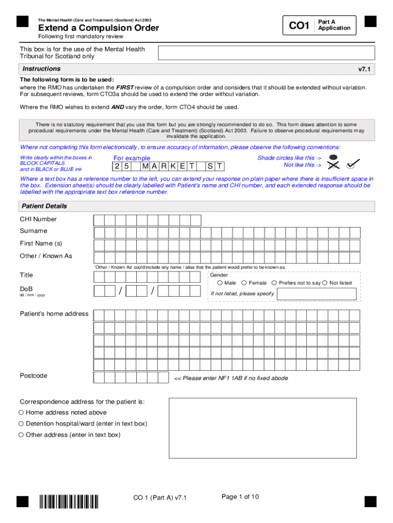 The Mental Health (Care and Treatment) (Scotland) Act 2003CO1Extend a Compulsion OrderPart A ApplicationFollowing first mandatory reviewThis box is for the use of the Mental Health Tribunal for Scotland