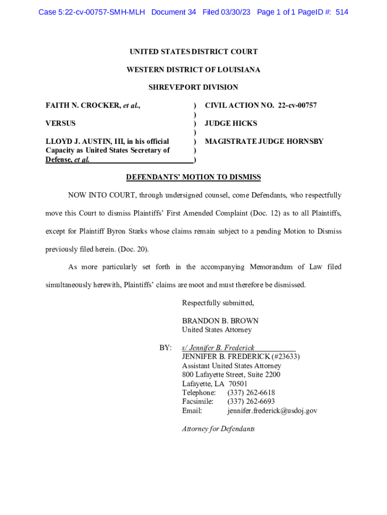 Case 5:22cv00757SMHMLH Document 34 Filed 03/30/23 Page 1 of 1 PageID #: 514UNITED STATES DISTRICT COURT WESTERN DISTRICT OF LOUISIANA SHREVEPORT DIVISION FAITH N. CROCKER, et al., VERSUS LLOYD J.