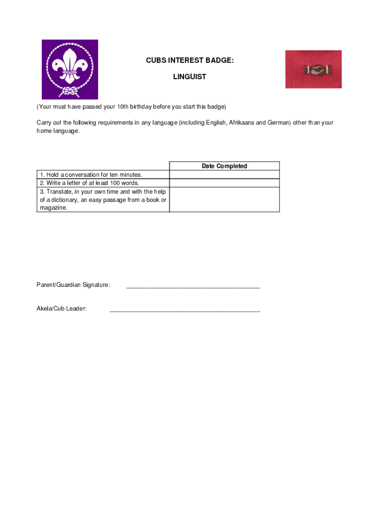 The Cubs Interest Badge Linguist is a personal form used by parents or guardians and Cub leaders to track a child’s completion of language-related activities for scouting.