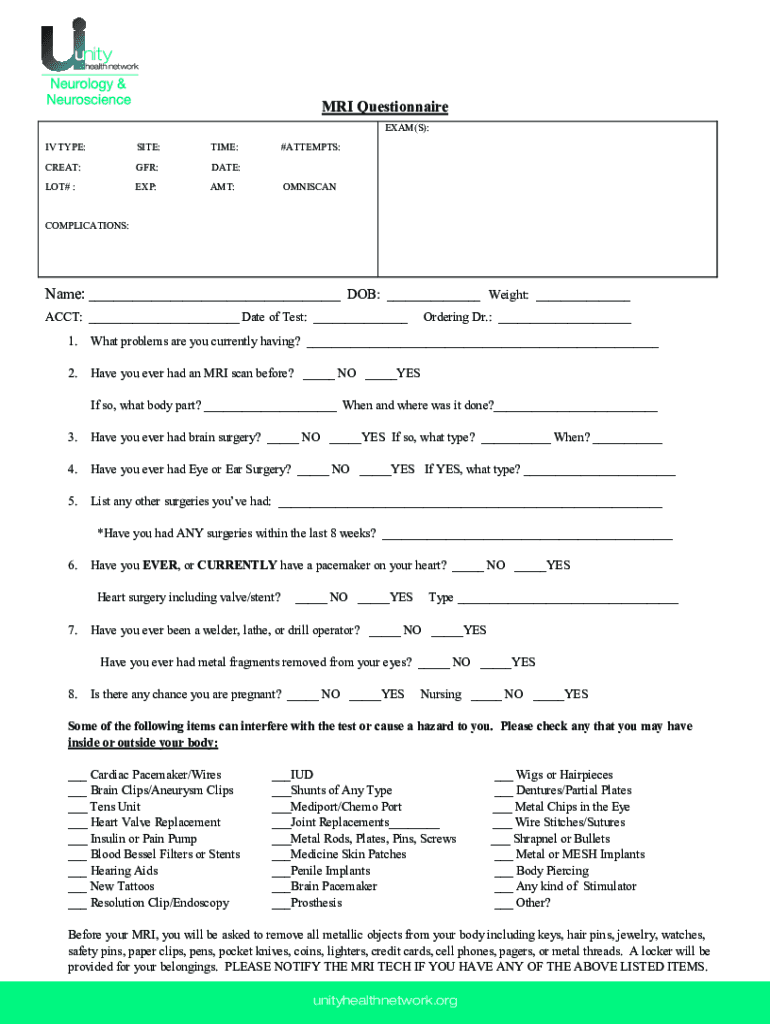 MRI Questionnaire EXAM(S): IV TYPE:SITE:TIME:CREAT:GFR:DATE:LOT# :EXP:AMT:#ATTEMPTS:OMNISCANCOMPLICATIONS:Name: ___ DOB: ___ Weight: ___ ACCT: ___ Date of Test: ___Ordering Dr.: ___1.What problems
