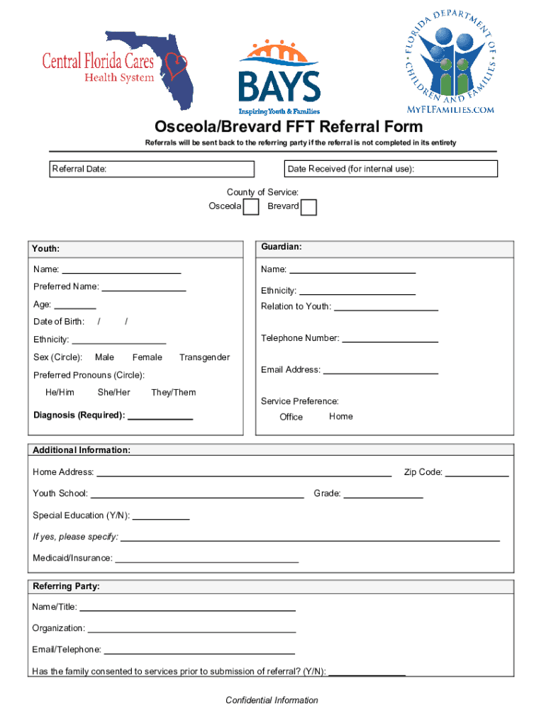 Osceola/Brevard FFT Referral FormReferrals will be sent back to the referring party if the referral is not completed in its entiretyReferral Date:Date Received (for internal use): County of Service: