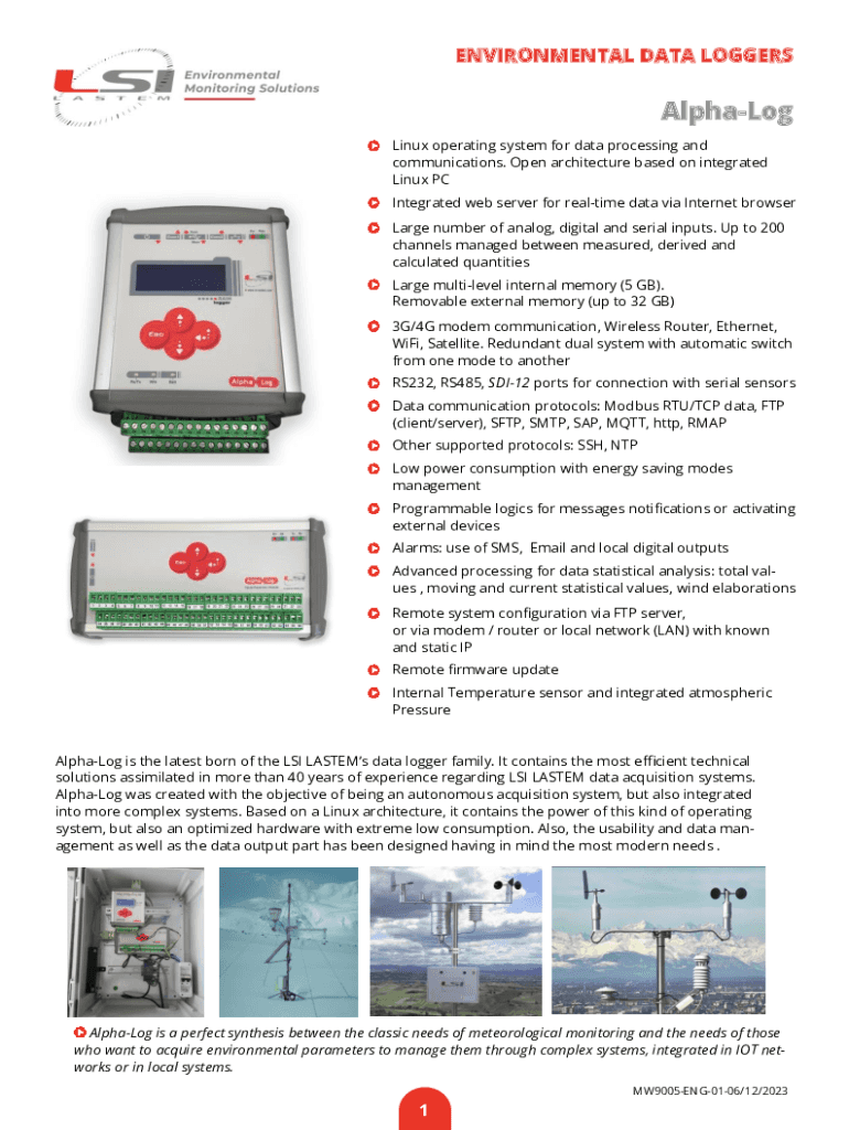 ENVIRONMENTAL DATA LOGGERSAlphaLog Linux operating system for data processing and communications. Open architecture based on integrated Linux PC Integrated web server for realtime data via Internet