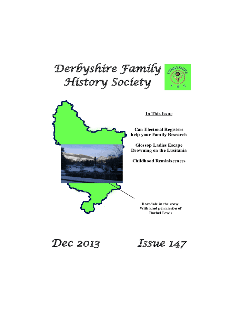 Derbyshire Family History Society In This Issue Can Electoral Registers help your Family Research Glossop Ladies Escape Drowning on the Lusitania Childhood ReminiscencesDovedale in the snow. With
