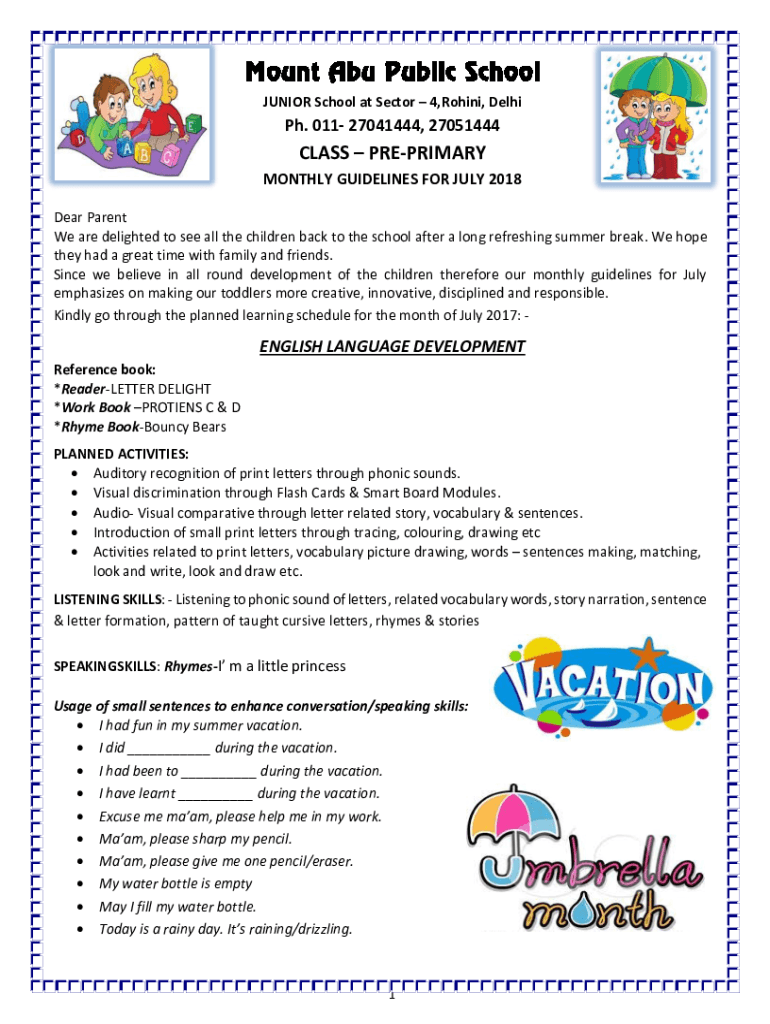 JUNIOR School at Sector 4,Rohini, DelhiPh. 011 27041444, 27051444CLASS PREPRIMARY MONTHLY GUIDELINES FOR JULY 2018 Dear Parent We are delighted to see all the children back to the school after a long