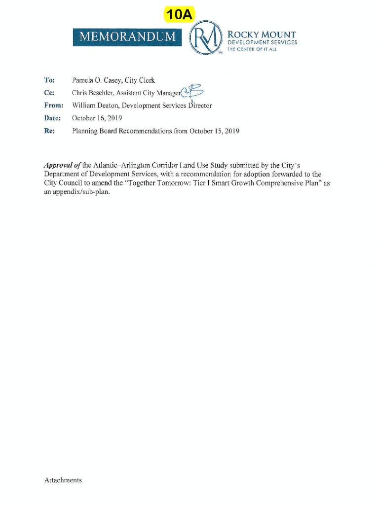 10A MEMORANDUMROCKY MOUNT DEVELOPMEN T SE RV ICES THE CE NTER OF IT A LLTo:Pamela 0. Casey, City ClerkCc:Chris Beschler, Assistant CityFrom:Wi lliam Deaton, Development Services DirectorDate:October