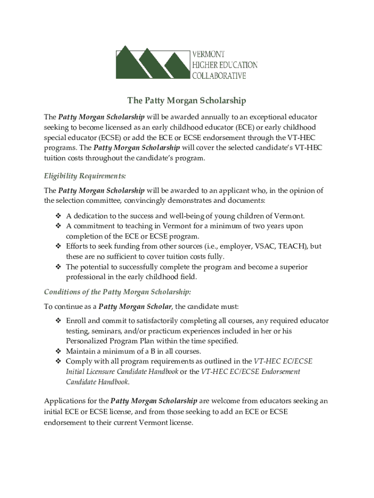 The Patty Morgan Scholarship The Patty Morgan Scholarship will be awarded annually to an exceptional educator seeking to become licensed as an early childhood educator (ECE) or early childhood special
