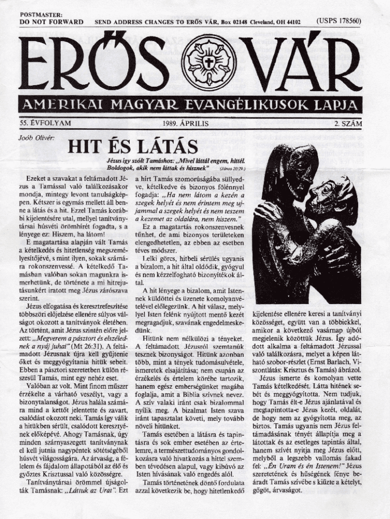 POSTMASTER: DO NT FORW ARDSEND ADDRESS CHANGES TO ERS VR, Box 02148 Cleveland, OH 44102ERS(USPS 178560)VRAMERIKAI MAGYAR EVANGLIKUSOK LAPJA55. VFOLYAM Job Olivr:_1989. PRILIS ,^2. SZM___r\"HIT S LTS
