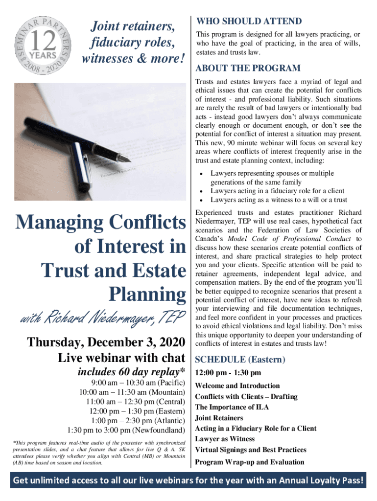 Joint retainers, fiduciary roles, witnesses & more!WHO SHOULD ATTEND This program is designed for all lawyers practicing, or who have the goal of practicing, in the area of wills, estates and trusts