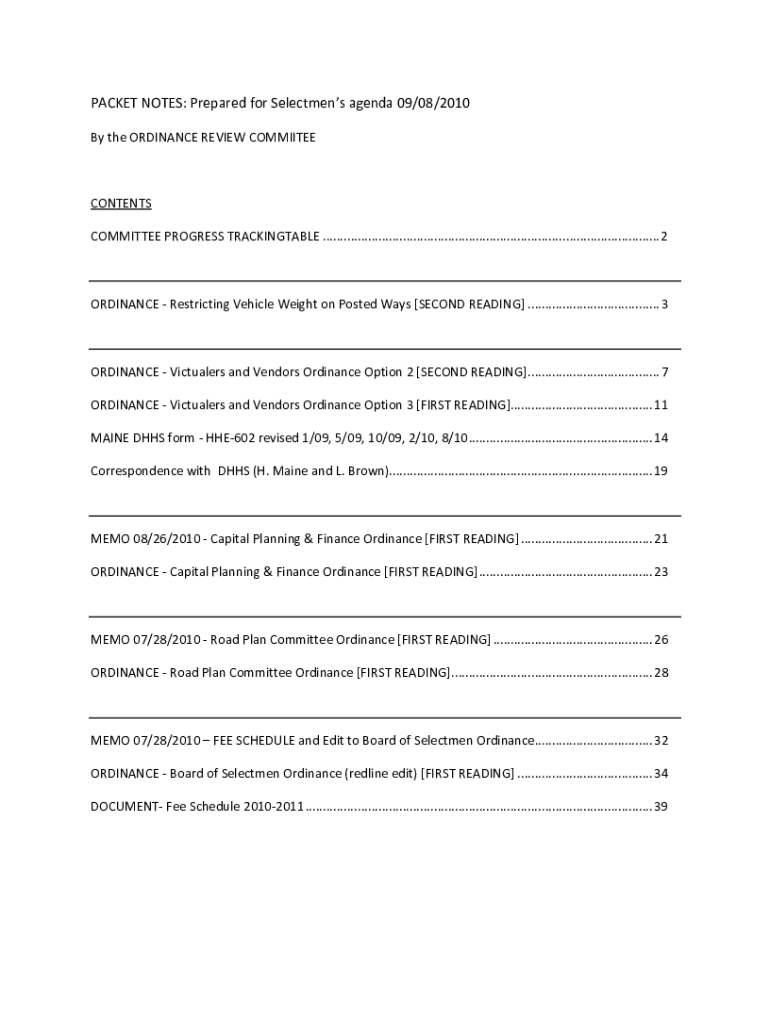 PACKET NOTES: Prepared for Selectmens agenda 09/08/2010 By the ORDINANCE REVIEW COMMIITEECONTENTS COMMITTEE PROGRESS TRACKINGTABLE .................................................................................................