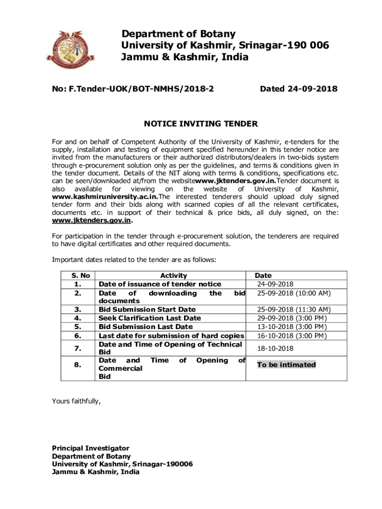 No: F. TenderUOK/BOTNETS/20182Dated 24092018NOTICE INVITING TENDER