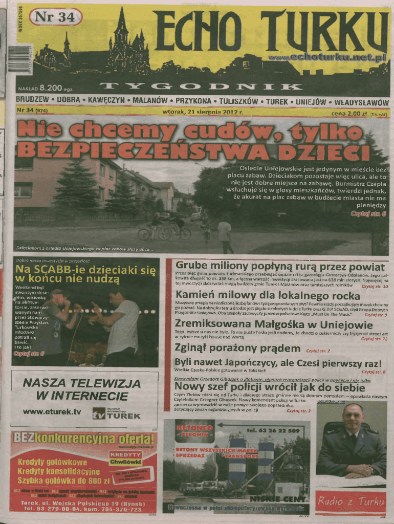 BRUDZEW * DOBRA KAWCZYN M A LAN W PRZYKONA TU LISZK W TUREK UN IEJ W W A D Y SA W W N r 3 4 (974)w t o r e k . 2 1 s ie r p n ia 2 0 1 ? rcena 2f00 z (s% vat) D ZIE O s ie d le U n ie jo w s k ie