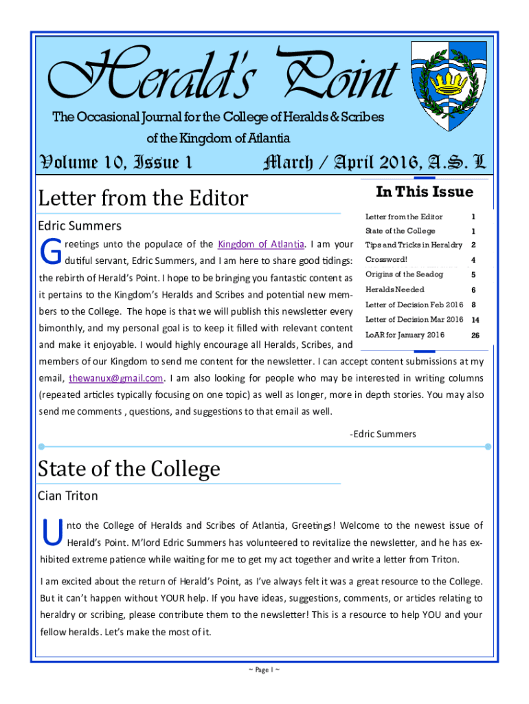 of the Kingdom of AtlantiaVolume 10, Issue 1March / April 2016, A.S. L