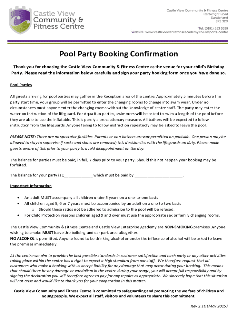 Pool Party Booking Confirmation Thank you for choosing the Castle View Community & Fitness Centre as the venue for your childs Birthday Party. Please read the information below carefully and sign