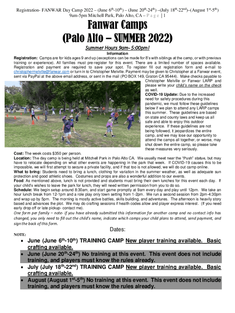 Registration FANWAR Day Camp 2022 (June 6th10th) (June 20th24th) (July 18th22nd)(August 1st5th) 9am5pm Mitchell Park, Palo Alto, CA P a g e | 1Fanwar Camps (Palo Alto SUMMER 2022) Summer Hours 9am