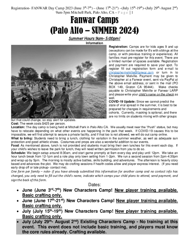 Registration FANWAR Day Camp 2023 (June 3th7th) (June 17th21st) (July 15th19th)(July 29thAugust 2nd) 9am5pm Mitchell Park, Palo Alto, CA P a g e | 1Fanwar Camps (Palo Alto SUMMER 2024) Summer Hours