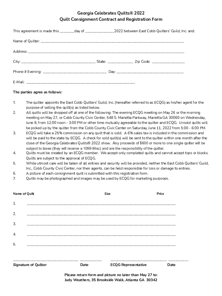 Georgia Celebrates Quilts 2022 Quilt Consignment Contract and Registration Form This agreement is made this ___day of ___2022 between East Cobb Quilters Guild, Inc. and: Name of Quilter: ___ Address: