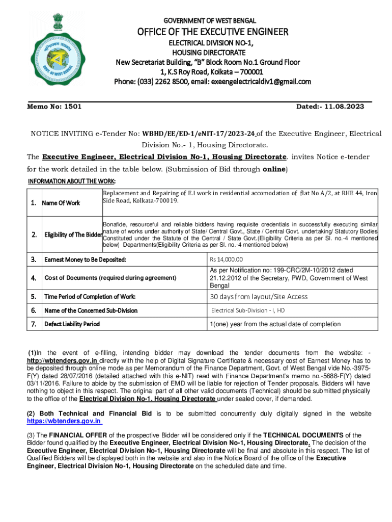 GOVERNMENT OF WEST BENGALOFFICE OF THE EXECUTIVE ENGINEER ELECTRICAL DIVISION NO1, HOUSING DIRECTORATE New Secretariat Building, B Block Room No.1 Ground Floor 1, K.S Roy Road, Kolkata 700001 Phone: