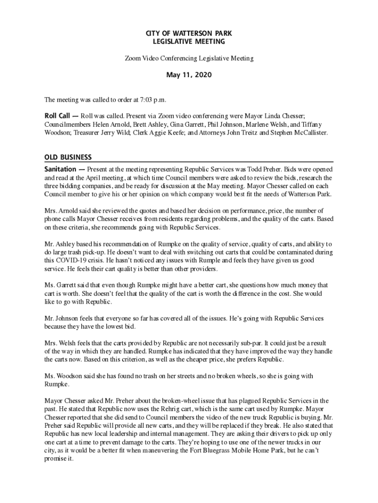 CITY OF WATTERSON PARK LEGISLATIVE MEETING Zoom Video Conferencing Legislative Meeting May 11, 2020 The meeting was called to order at 7:03 p.m. Roll Call Roll was called. Present via Zoom video conferencing