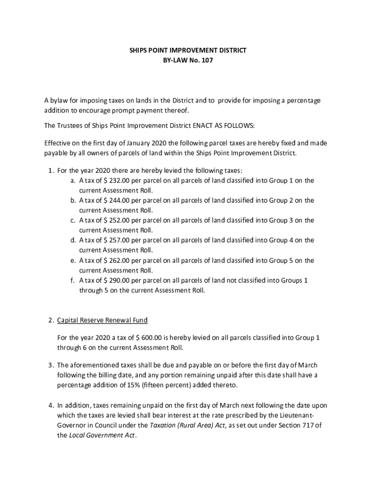 SHIPS POINT IMPROVEMENT DISTRICT BYLAW No. 107A bylaw for imposing taxes on lands in the District and to provide for imposing a percentage addition to encourage prompt payment thereof. The Trustees