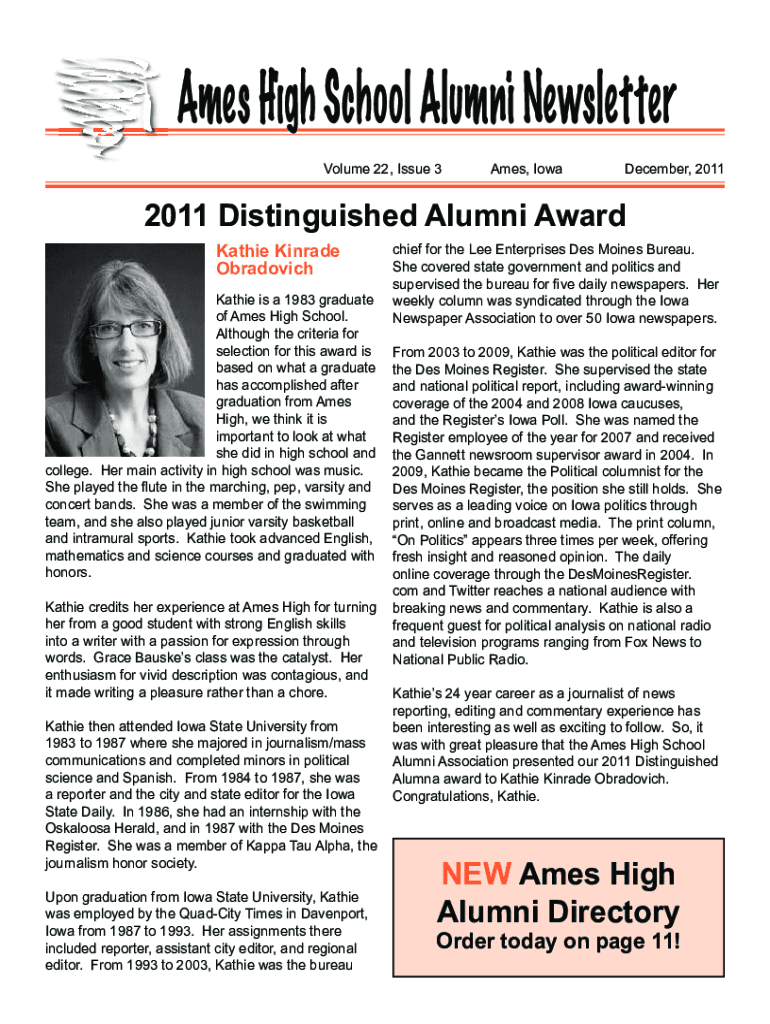 Volume 22, Issue 3Ames, IowaDecember, 20112011 Distinguished Alumni Award Kathie Kinrade Obradovich Kathie is a 1983 graduate of Ames High School. Although the criteria for selection for this award
