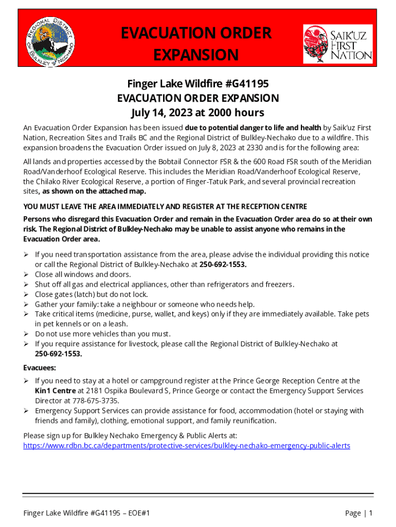 EVACUATION ORDER EXPANSION Finger Lake Wildfire #G41195 EVACUATION ORDER EXPANSION July 14, 2023 at 2000 hours An Evacuation Order Expansion has been issued due to potential danger to life and health