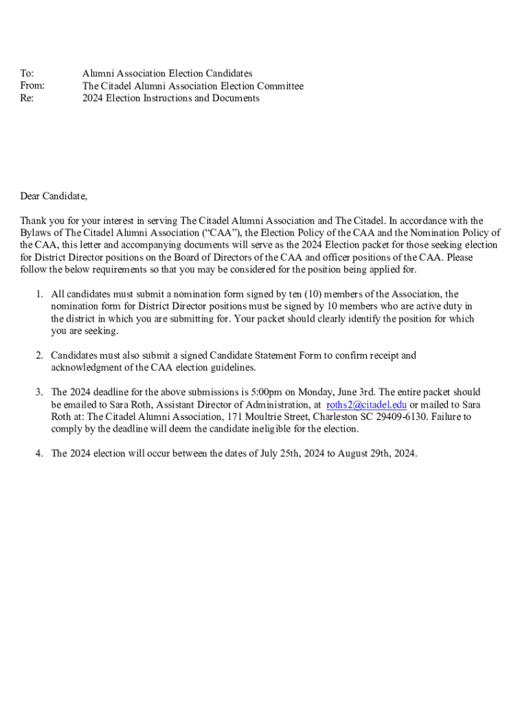 To: From: Re:Alumni Association Election Candidates The Citadel Alumni Association Election Committee 2024 Election Instructions and DocumentsDear Candidate, Thank you for your interest in serving