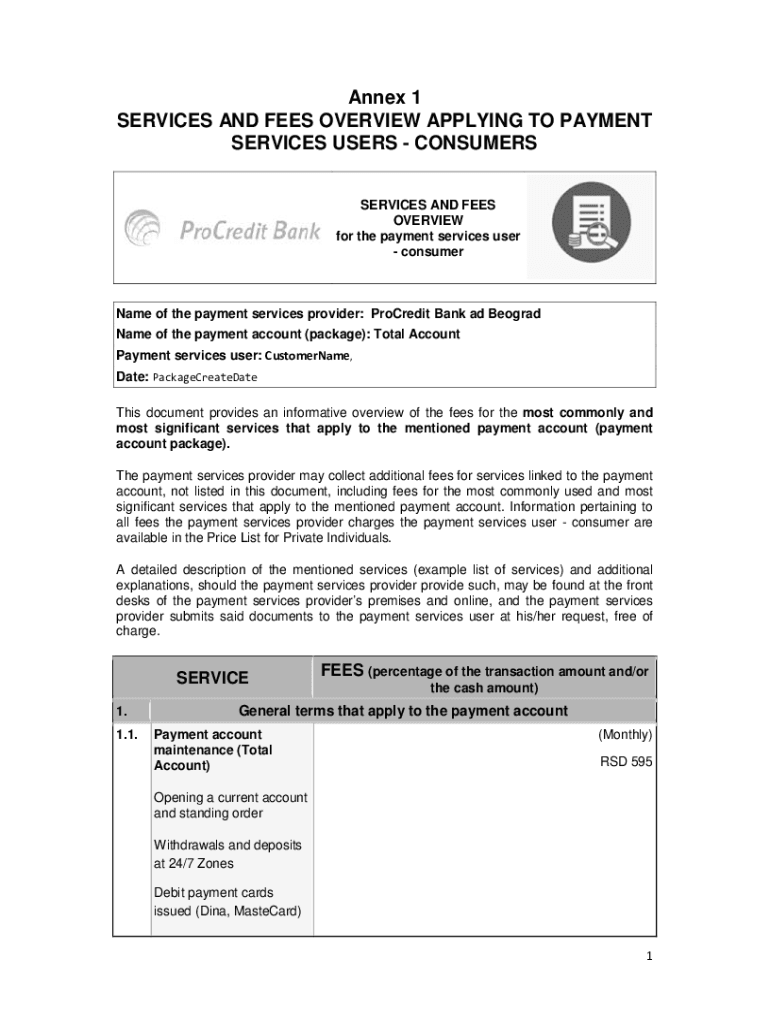 Annex 1 SERVICES AND FEES OVERVIEW APPLYING TO PAYMENT SERVICES USERS CONSUMERS SERVICES AND FEES OVERVIEW for the payment services user consumerName of the payment services provider: ProCredit Bank