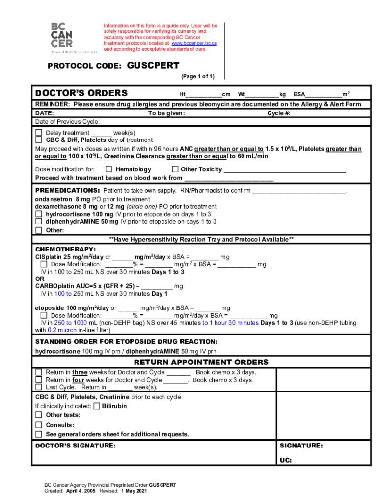 Information on this form is a guide only. User will be solely responsible for verifying its currency and accuracy with the corresponding BC Cancer treatment protocols located at www.bccancer.bc.ca