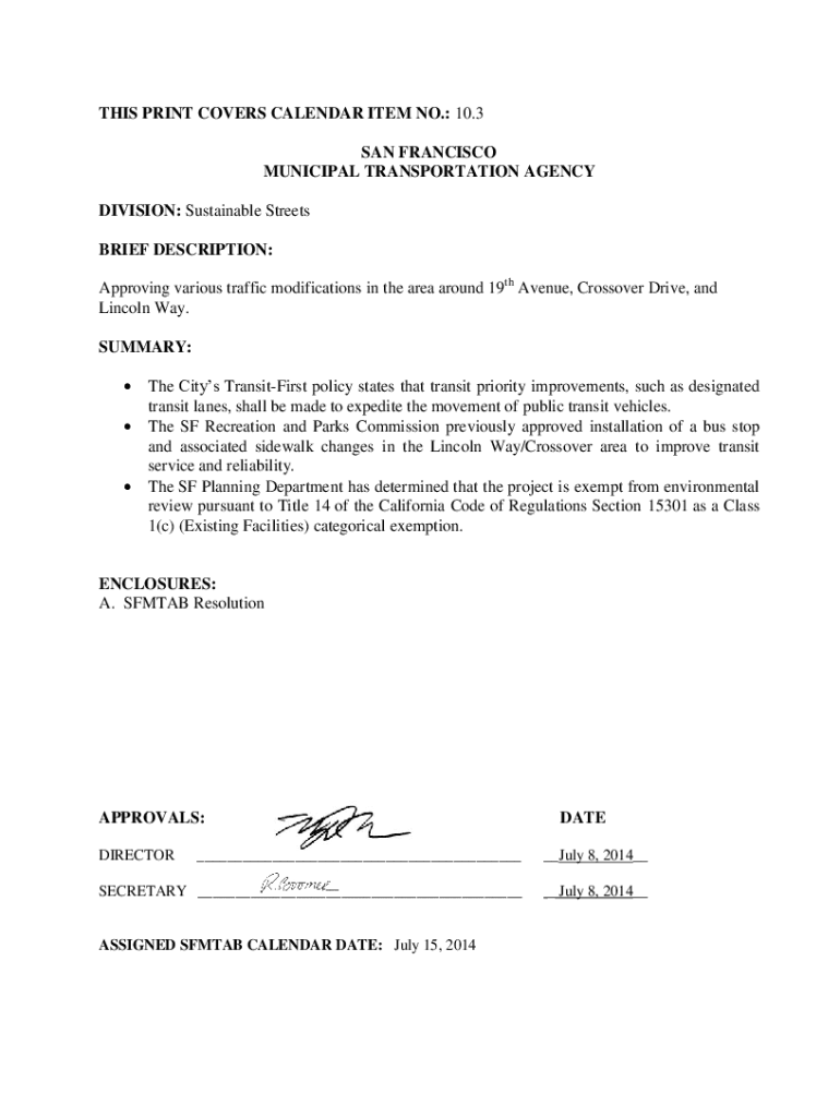 THIS PRINT COVERS CALENDAR ITEM NO.: 10.3 SAN FRANCISCO MUNICIPAL TRANSPORTATION AGENCY DIVISION: Sustainable Streets BRIEF DESCRIPTION: Approving various traffic modifications in the area around