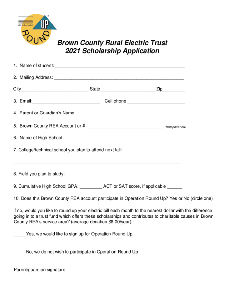 Brown County Rural Electric Trust 2021 Scholarship Application 1. Name of student: ___ 2. Mailing Address: ___ City___ State ___Zip___ 3. Email:___Cell phone ___4. Parent or Guardians Name___ 5. Brown