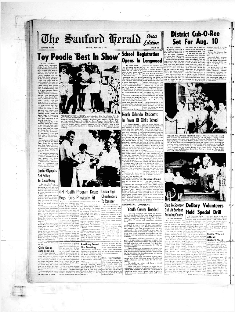 I X 1B E fr\" S r n tlftPAGE 12School Registration Opens In Longwoodw ;IP*M w IflOs* i*1 \' .\'j\'IBy Ja n * Casselberry Andre, petite twomonthsold toy French Poodle belong ing to Marsha Pope of Cauelberry,