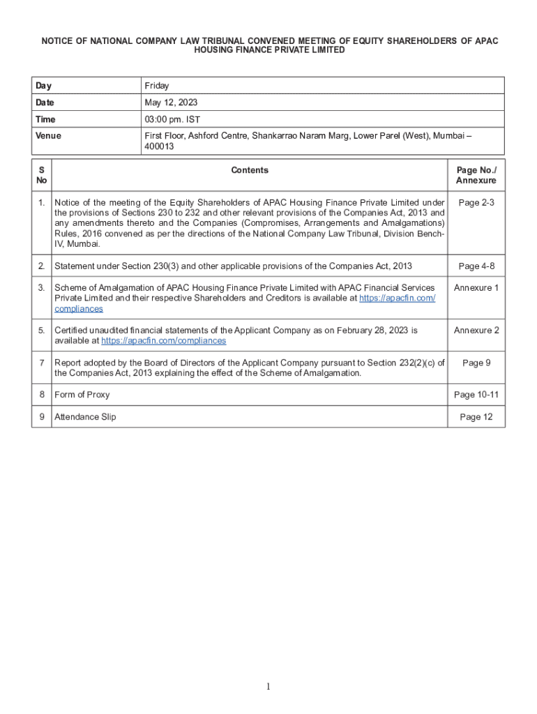NOTICE OF NATIONAL COMPANY LAW TRIBUNAL CONVENED MEETING OF EQUITY SHAREHOLDERS OF APAC
