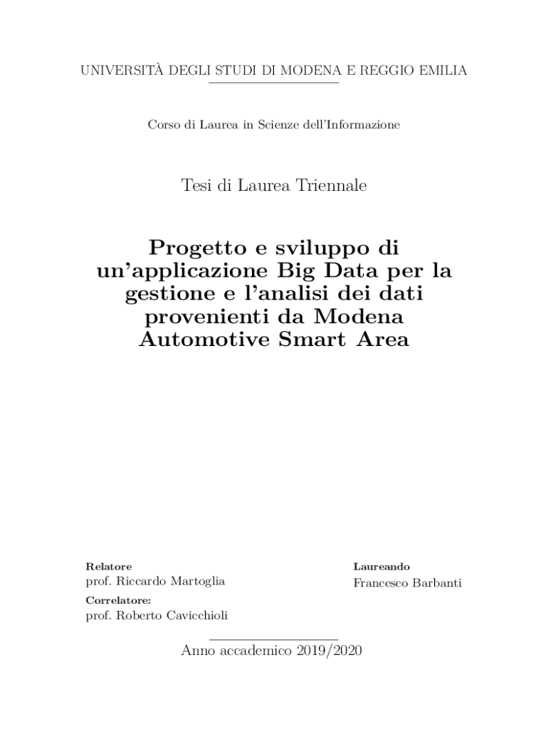 UNIVERSIT DEGLI STUDI DI MODENA E REGGIO EMILIACorso di Laurea in Scienze dellInformazioneTesi di Laurea TriennaleProgetto e sviluppo di unapplicazione Big Data per la gestione e lanalisi dei dati