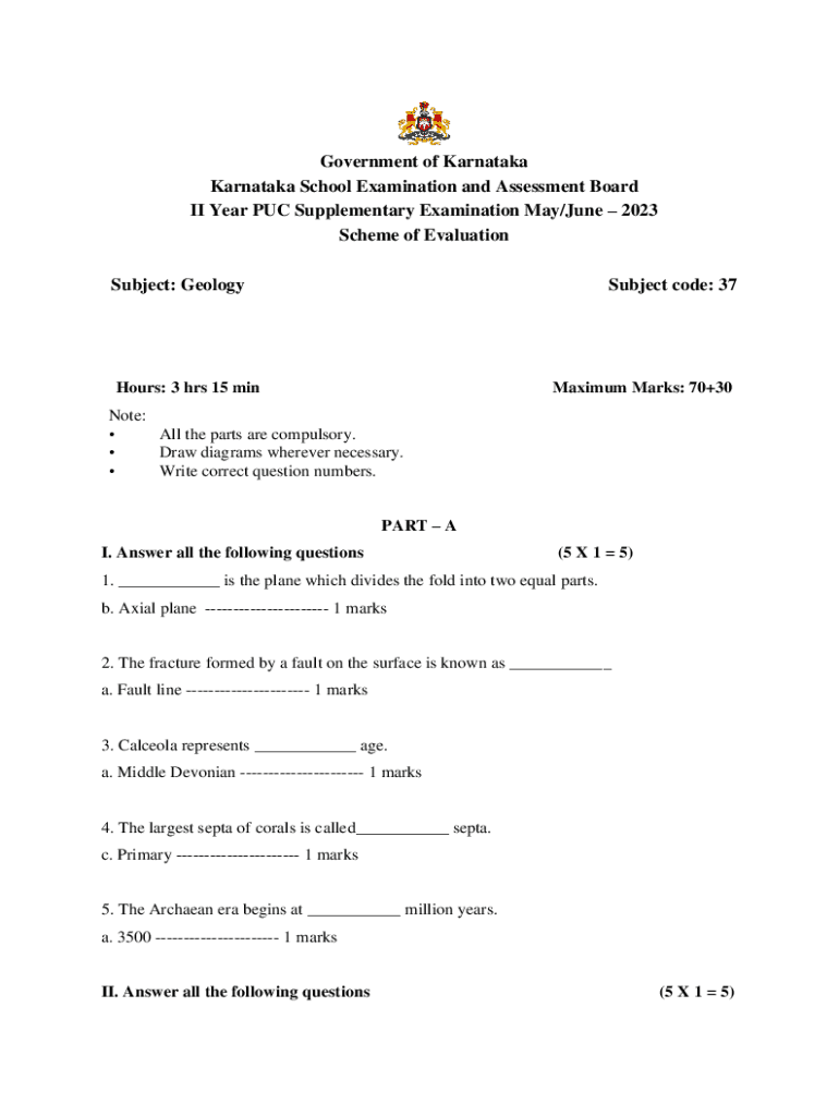 Government of Karnataka Karnataka School Examination and Assessment Board II Year PUC Supplementary Examination May/June 2023 Scheme of Evaluation Subject: GeologySubject code: 37Hours: 3 hrs 15 minMaximum