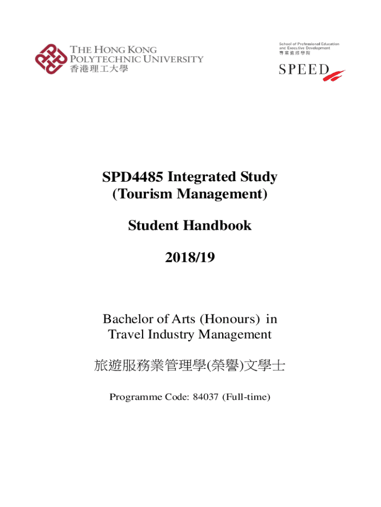 SPD4485 Integrated Study (Tourism Management) Student Handbook 2018/19Bachelor of Arts (Honours) in Travel Industry Management () Programme Code: 84037 (Fulltime)IS(TIM) Student Handbook 2018/19BA