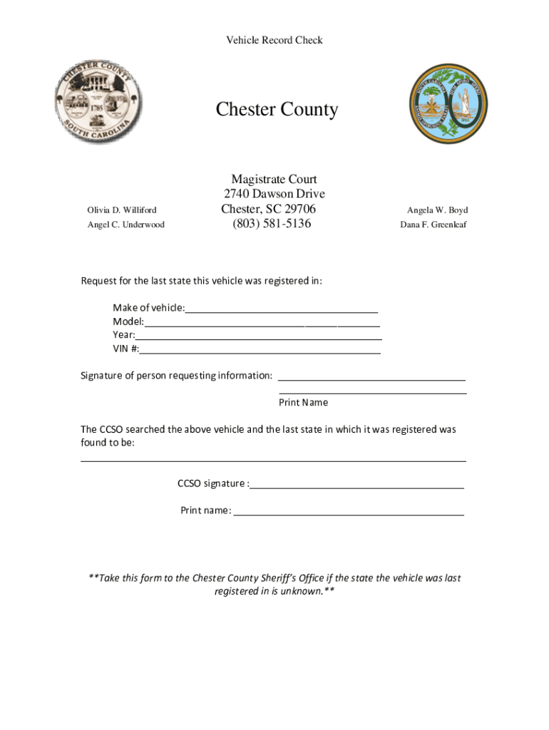 Vehicle Record CheckChester CountyOlivia D. Williford Angel C. UnderwoodMagistrate Court 2740 Dawson Drive Chester, SC 29706 (803) 5815136Angela W. Boyd Dana F. GreenleafRequest for the last state