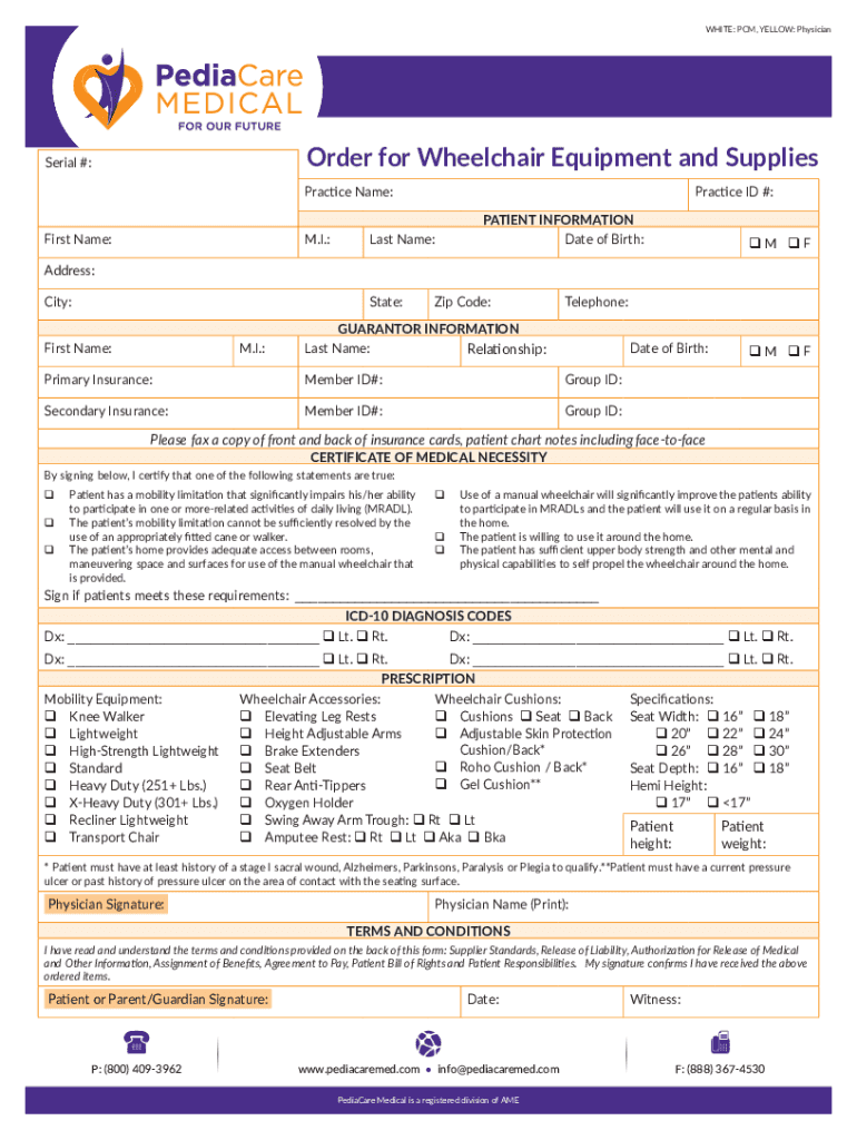WHITE: PCM, YELLOW: PhysicianOrder for Wheelchair Equipment and SuppliesSerial #:Practice Name: First Name:M.I.:Practice ID #:Last Name:PATIENT INFORMATION Date of Birth:qM qFAddress: City:State:First
