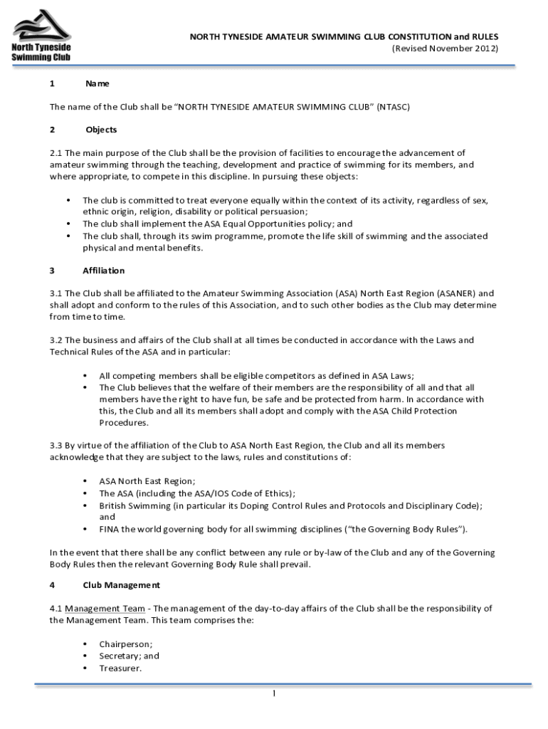 NORTHTYNESIDEAMATEURSWIMMINGCLUBCONSTITUTIONandRULES (RevisedNovember2012) 1Name ThenameoftheClubshallbeNORTHTYNESIDEAMATEURSWIMMINGCLUB(NTASC) 2Objects 2.1ThemainpurposeoftheClubshallbetheprovisionoffacilitiestoencouragetheadvancement