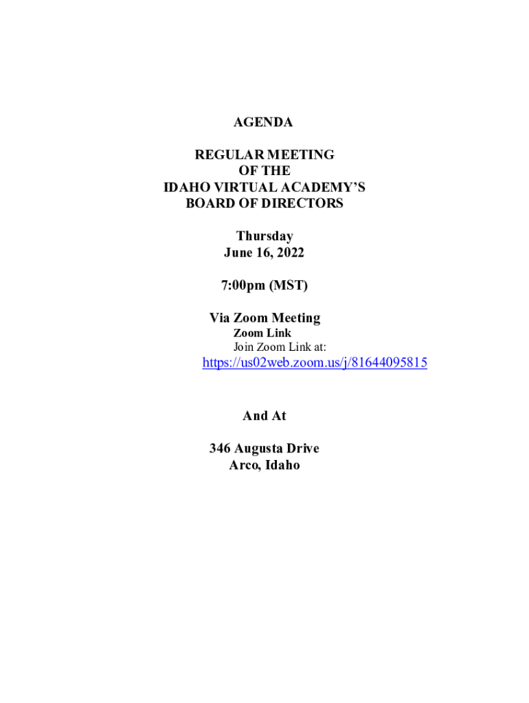 AGENDA REGULAR MEETING OF THE IDAHO VIRTUAL ACADEMYS BOARD OF DIRECTORS Thursday June 16, 2022 7:00pm (MST) Via Zoom Meeting Zoom Link Join Zoom Link at:https://us02web.zoom.us/j/81644095815And At