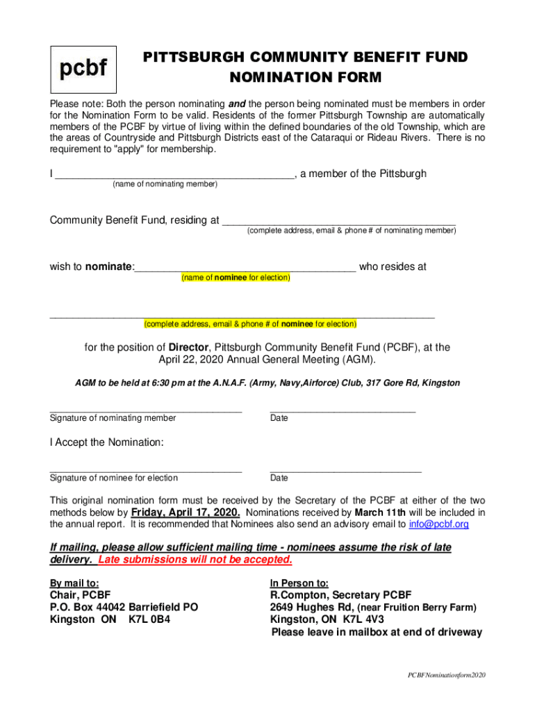 PITTSBURGH COMMUNITY BENEFIT FUND NOMINATION FORM Please note: Both the person nominating and the person being nominated must be members in order for the Nomination Form to be valid. Residents of