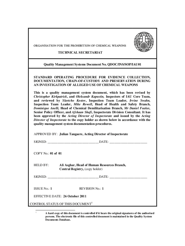 TECHNICAL SECRETARIATQuality Management Systems Document No. QDOC/INS/SOP/IAU01STANDARD OPERATING PROCEDURE FOR EVIDENCE COLLECTION, DOCUMENTATION, CHAINOFCUSTODY AND PRESERVATION DURING AN INVESTIGATION