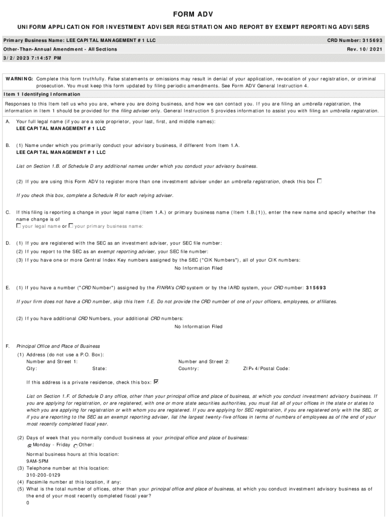 FORM ADV UNIFORM APPLICATION FOR INVESTMENT ADVISER REGISTRATION AND REPORT BY EXEMPT REPORTING ADVISERS Primary Business Name: LEE CAPITAL MANAGEMENT #1 LLCCRD Number: 315693OtherThanAnnual Amendment