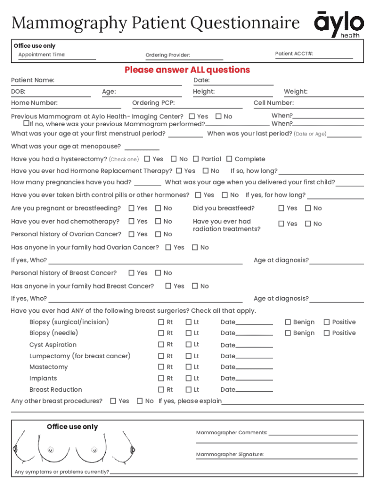 Mammography Patient Questionnaire Office use onlyAppointment Time:Please answer ALL questions Date:Patient Name:DOB:Patient ACCT#:Ordering Provider:Age:Height:Home Number:Weight:Ordering PCP:Cell