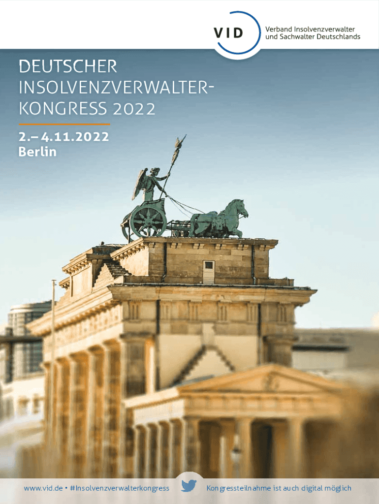 DEUTSCHER INSOLVENZVERWALTERKONGRESS 2022 2. 4.11.2022 Berlinwww.vid.de #InsolvenzverwalterkongressKongressteilnahme ist auch digital mglichMi 2.11.202217:00 19:00Ordentliche Mitgliederversammlung