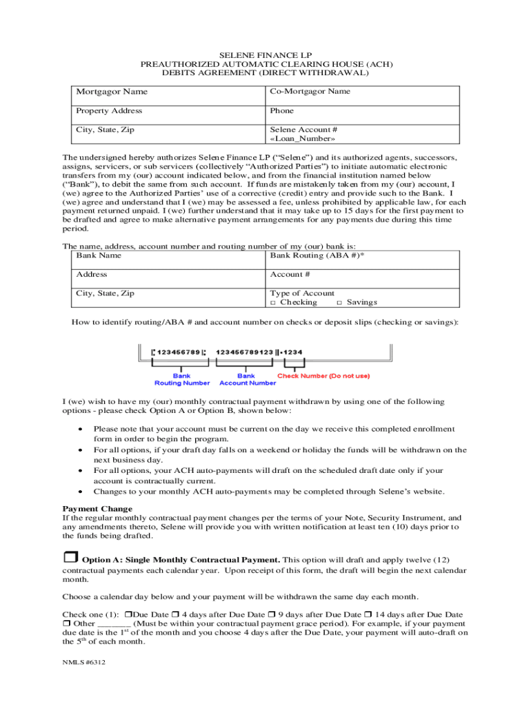 SELENE FINANCE LP PREAUTHORIZED AUTOMATIC CLEARING HOUSE (ACH) DEBITS AGREEMENT (DIRECT WITHDRAWAL)Mortgagor NameCoMortgagor NameProperty AddressPhoneCity, State, ZipSelene Account # Loan_NumberThe