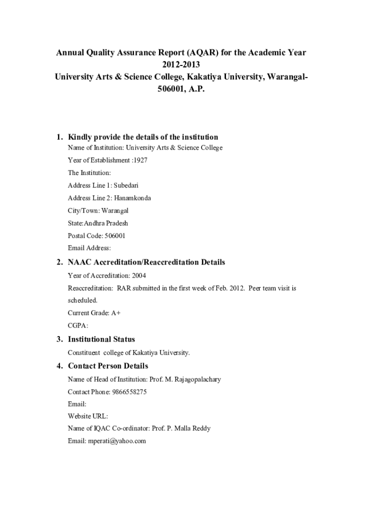 University Arts & Science College, Galatia University, Warangal506001, A.P.1. Kindly provide the details of the institution