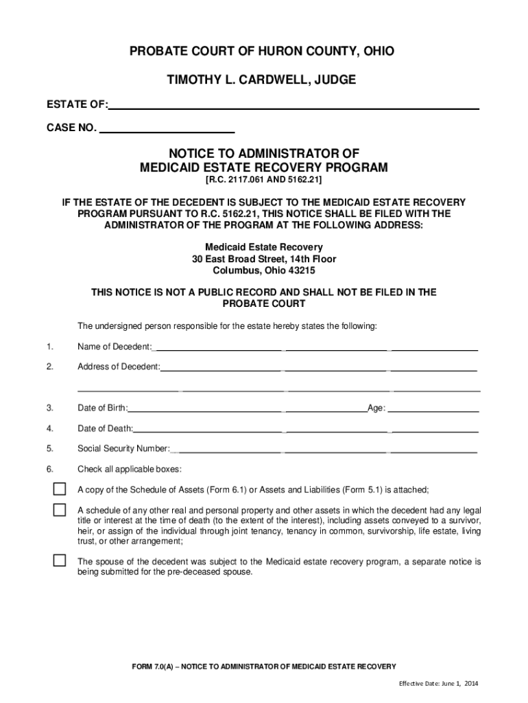 PROBATE COURT OF HURON COUNTY, OHIO TIMOTHY L. CARDWELL, JUDGE ESTATE OF: CASE NO.NOTICE TO ADMINISTRATOR OF MEDICAID ESTATE RECOVERY PROGRAM [R.C. 2117.061 AND 5162.21]IF THE ESTATE OF THE DECEDENT