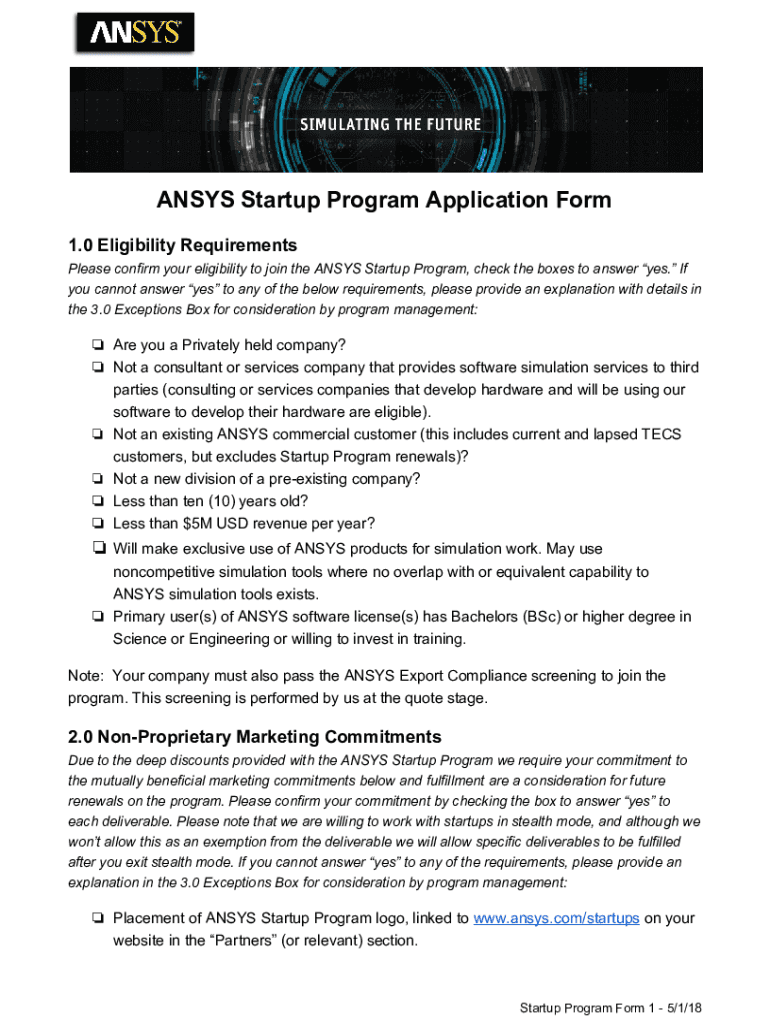 ANSYS Startup Program Application Form 1.0 Eligibility Requirements Please confirm your eligibility to join the ANSYS Startup Program, check the boxes to answer yes. If you cannot answer yes to any