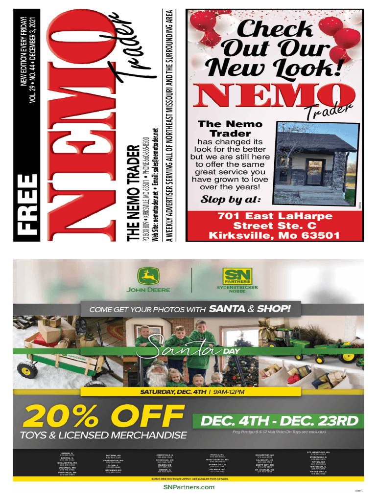 A WEEKLY ADVERTISER SERVING ALL OF NORTHEAST MISSOURI AND THE SURROUNDING AREAPO BOX 809 KIRKSVILLE, MO 63501 PHONE 6606658500 Web Site: nemotrader.net Email: sales@nemotrader.netTHE NEMO TRADERFREE