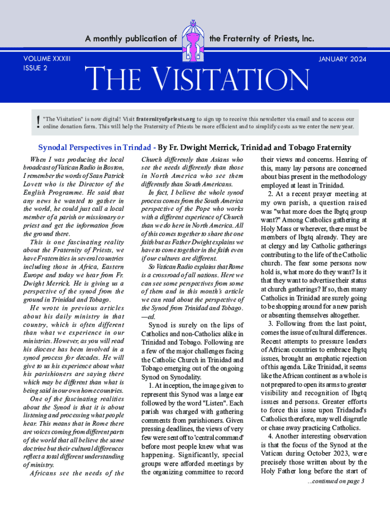 A monthly publication of VOLUME XXXIII ISSUE 2!the Fraternity of Priests, Inc.The VisitationJANUARY 2024\"The Visitation\" is now digital! Visit fraternityofpriests.org to sign up to receive this